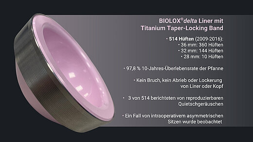 BIOLOX®delta ist ein hochgradig biokompatibles und hypoallergenes Keramikmaterial. BIOLOX®delta weist sehr günstige physikalisch-chemische Eigenschaften auf, die zu einer hervorragenden Benetzbarkeit und einer sehr hohen Verschleißfestigkeit führen. BIOLOX®delta ist sicher hinsichtlich der Freisetzung von Metallionen. Pathogene Reaktionen auf Keramikpartikel sind sehr unwahrscheinlich. Die Referenzen für alle nachstehenden Aussagen finden Sie hier.