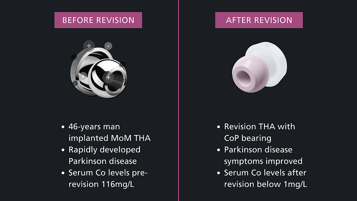 A study from the review, Woelber et al. featured the case study of a 46-year-old man who developed rapidly progressing Parkinson’s disease symptoms after MoM THA. Following revision arthroplasty using Ceramic on Poly bearings, his symptoms improved. Serum Co levels pre-revision were measured at 116mg/L, and declined after revision below 1mg/L. The authors recommended further evaluation of the possible link between Parkinson’s disease symptoms and prosthesis wear-induced hypercobaltemia.