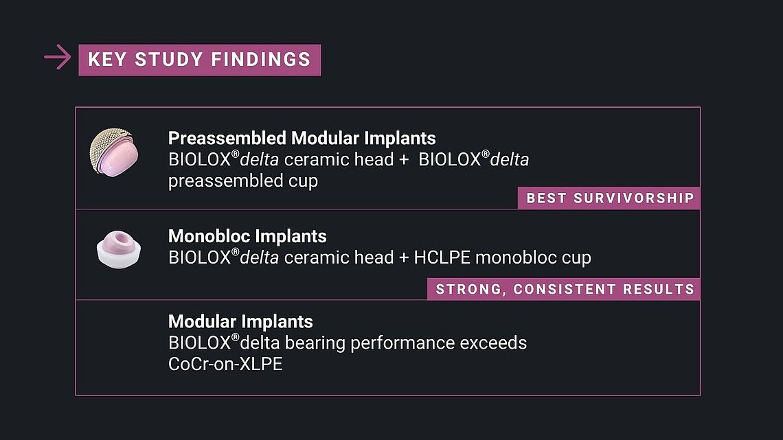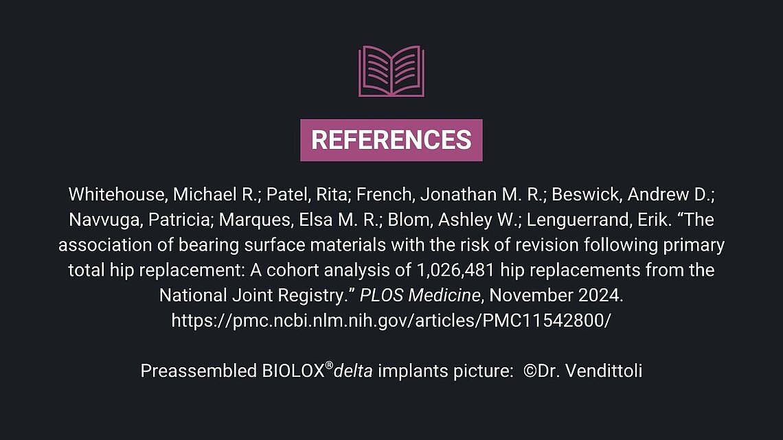 Whitehouse et al. concludes that bearing materials influence the outcome of the primary procedure and that – due to their reduced incidence of wear, biofilm development, and fretting corrosion – BIOLOX®delta bearings seem to lower the risk of revision in comparison with the standard of care in the UK. The team acknowledges the difficulty of accounting for all influencing factors given that the trial was neither randomized nor controlled. They also emphasize that more research is needed on the correlation between implant bearing materials and the risk of rehospitalization, other re-operation, mortality, and material cost-effectiveness.