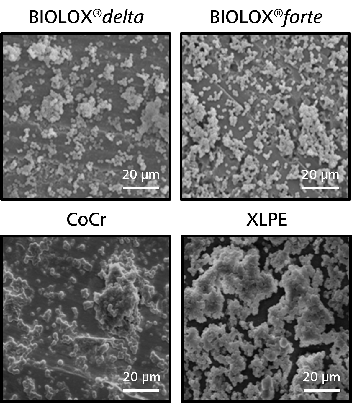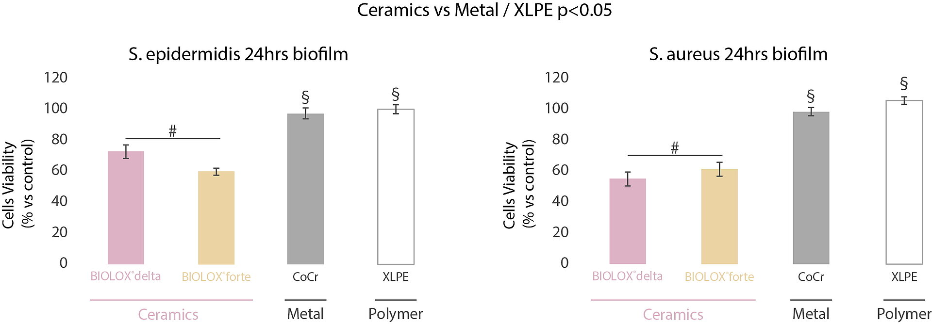 In a multicentric and interdisciplinary study7, we compared the bacteria adhesion mechanisms on CoCr, XLPE, alumina (BIOLOX®forte) and zirconia-toughened alumina (ZTA) ceramic (BIOLOX®delta). The MTT evaluation of the biofilm formed on the surface of the investigated orthopedic materials indicated the highest biofilm viability for XLPE and CoCrMo surfaces after 24 hours (Fig. 2).