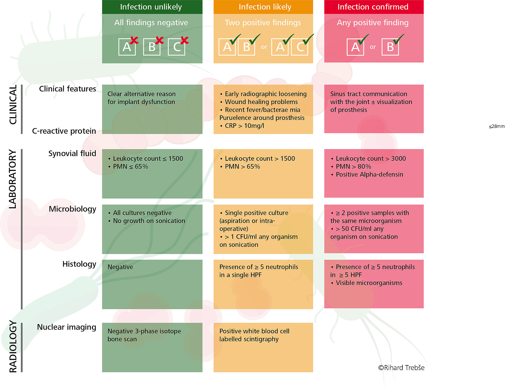 To overcome this problem, the European Bone and Joint Infection Society (EBJIS) has recently proposed the novel 'traffic light' approach (Figure 1), which divides patients by the likelihood of infection (green or amber) or confirmed infection (red).11 The approach is not binary (i.e., 'infection' or 'no infection') and it has shown clinically to detect a higher percentage of lowgrade infections.8,12
