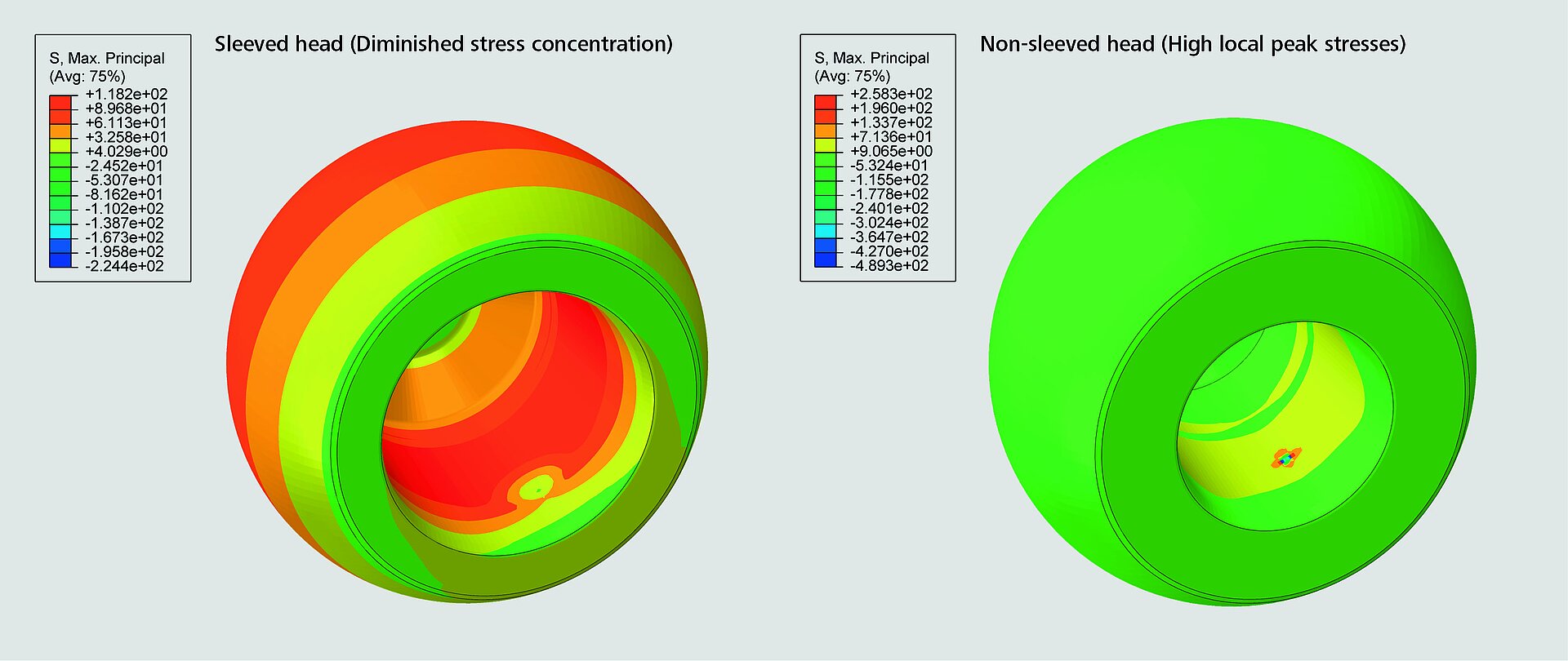 The numerical simulations4 showed comparable fracture forces for truncated, slanted and crushed tapers for both sleeved and non-sleeved heads. However, the investigation showed that small local metal elevations at the edge of a scratch or at a surface damage can lead to early failure of non-sleeved ceramic heads despite their high fracture strength. Indeed, high local stress peaks generated by a small metal elevation (“scratch”) drastically reduced the fracture strength of non-sleeved heads (−96%), whereas sleeved heads remained unaffected.