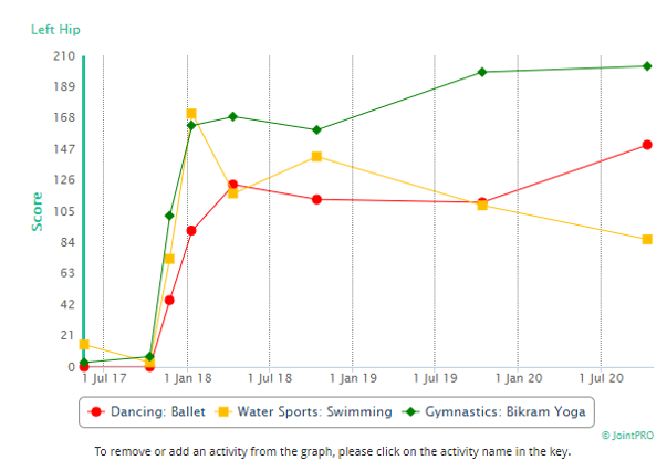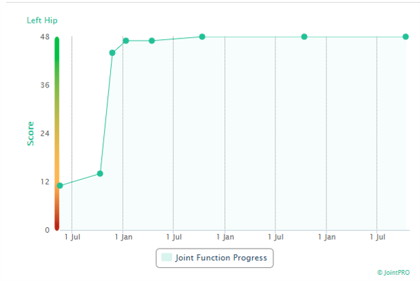 In functional terms, the patient returned to work rapidly, both on land and underwater. Full marks were achieved with the Oxford Hip Score within 6 months after surgery, while substantial functional gains were still captured in the second postoperative year using personalized score Imperial Score, where 100% is the preoperative aspiration for each activity (figures 6a and 6b).