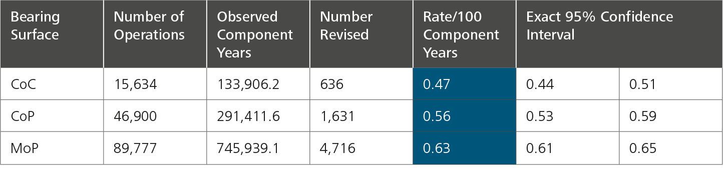Rate/100 component years: equivalent to the yearly revision rate expressed as a percentage figure derived by dividing the number of prostheses revised by the observed component years multiplied by 100.
