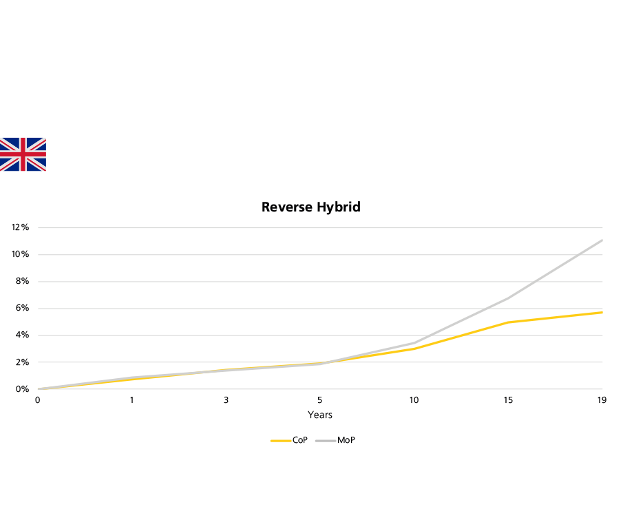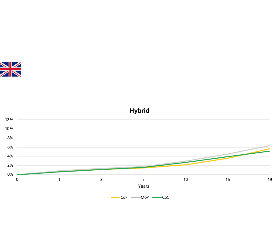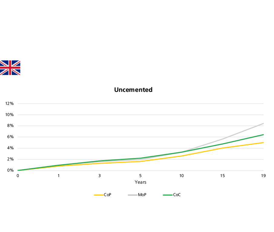 Figure 16: Cumulative revision rates in primary hip replacement with Mop, CoP, and CoC bearings in combination with different fixation methods in England, Wales, Northern Ireland, the Isle of Man and Guernsey.