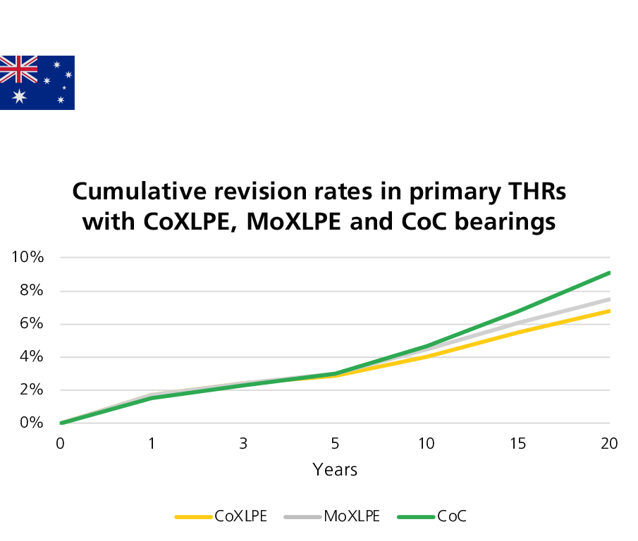 Figure 17: Cumulative revision rates in primary THR with CoXLPE, MoXLPE and CoC bearings (Primary Diagnosis OA) in Australia.