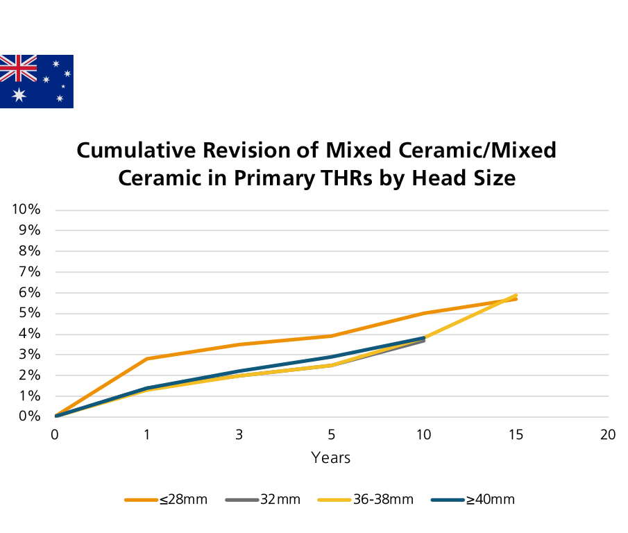 Figure 19: Cumulative revision of mixed ceramic/mixed ceramic bearings (Primary Diagnosis OA, restricted to modern prostheses) by head size in Australia.
