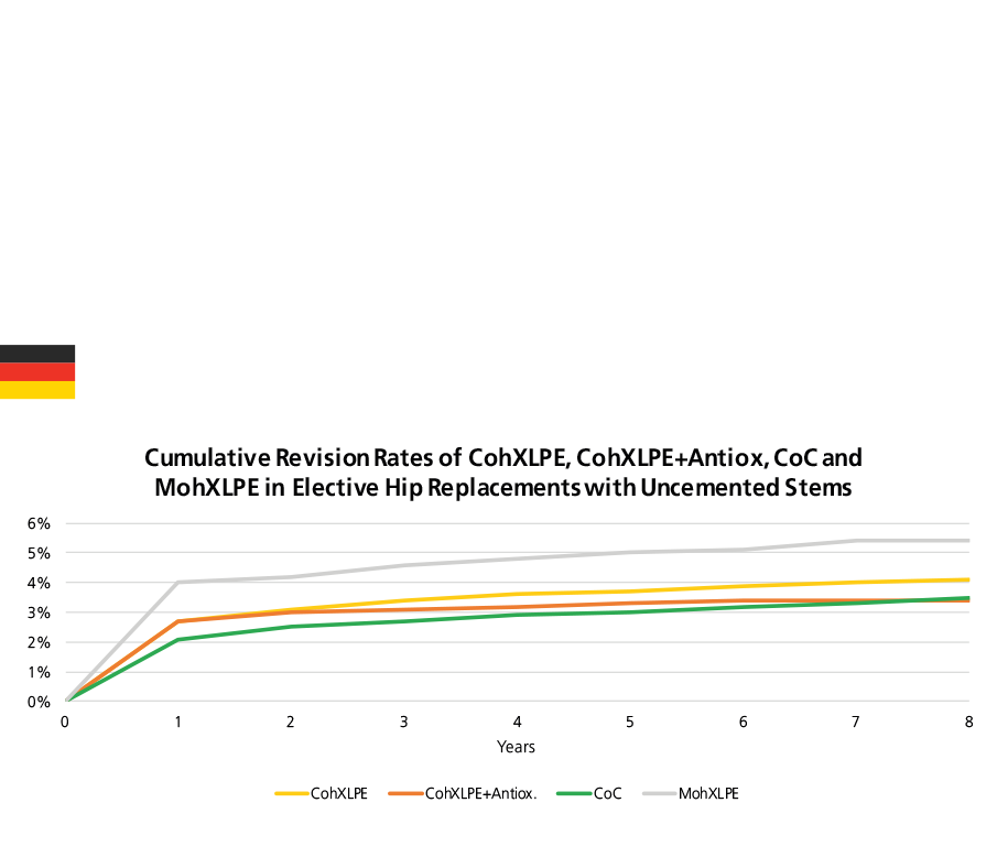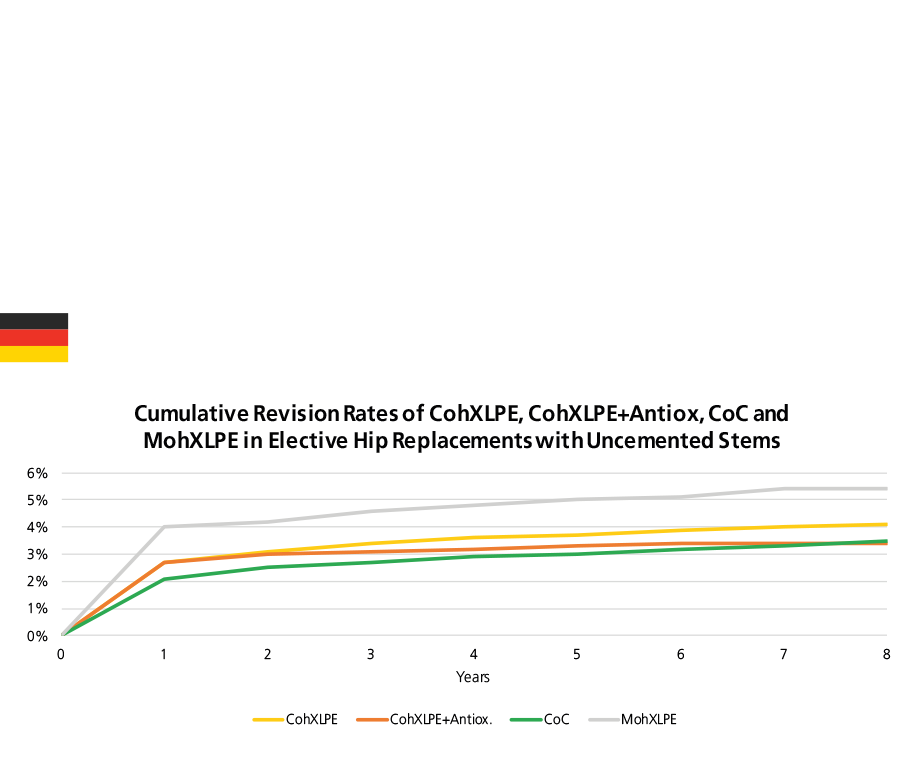 Figure 20: Cumulative revision rates of CohXLPE, CohXLPE+Antiox, MohXLPE and CoC in elective hip replacement by stem fixation in Germany.
