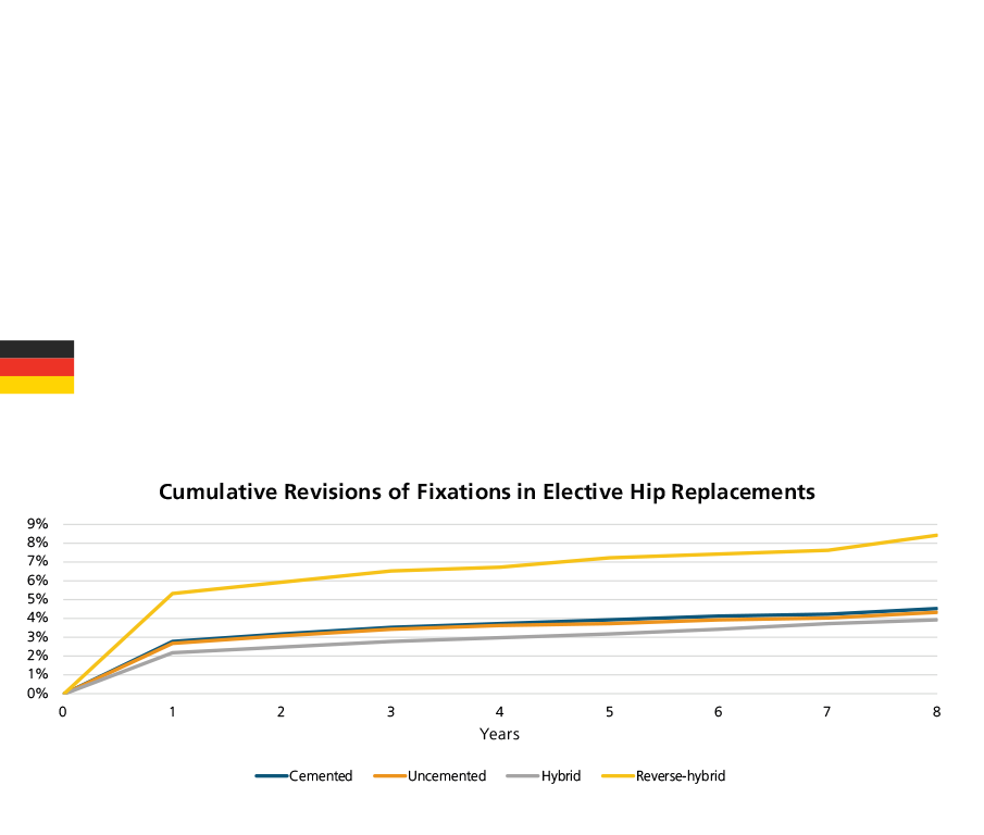 Figure 21: Cumulative revision rates of different fixations in elective hip replacement in Germany.