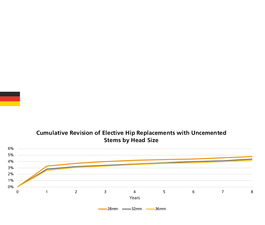 Figure 22: Cumulative revision rates of head size in elective hip replacement with different fixations in Germany.