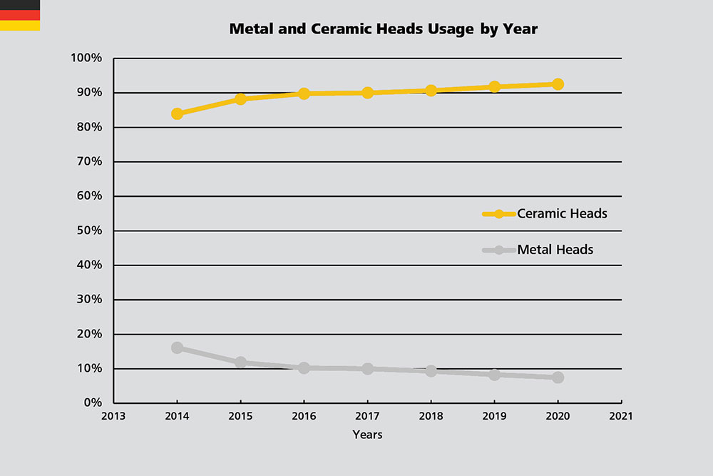 Figure 4: Percentage of ceramic and metal femoral heads by year in Germany.
