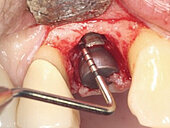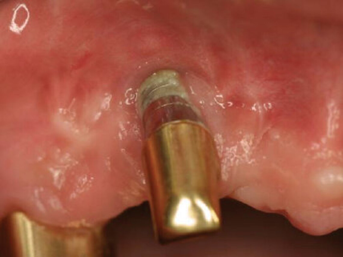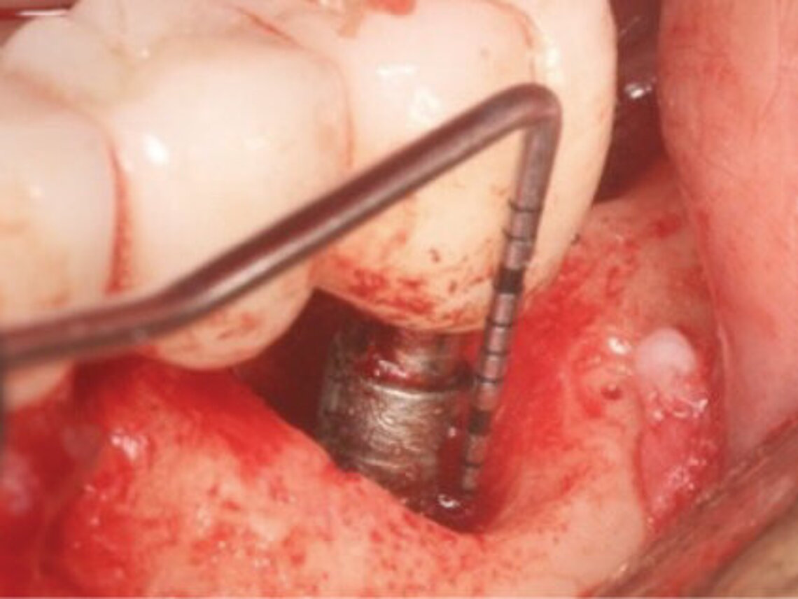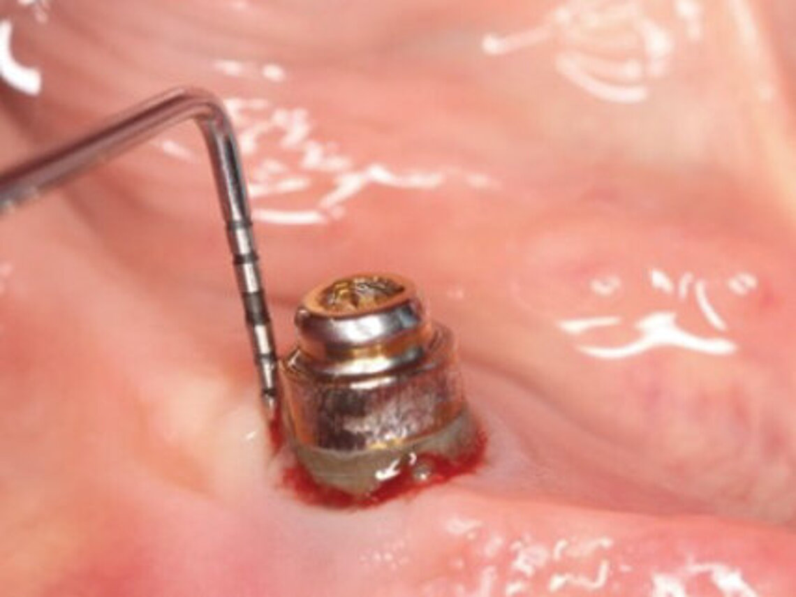 Peri-implant mucositis can be defined as an inflammatory lesion of the soft tissues (mucosa) surrounding the dental implant. Peri-implantitis is an inflammatory lesion of the mucosa affecting the supporting bone (crestal bone) with crestal bone loss and loss of osseointegration. Derks et al. report a prevalence of 43% for peri-implant mucositis and Jepsen et al. estimate that the prevalence of peri-implantitis could reach 22% (Figs. 1, 2).2,3 Peri-implantitis is usually accompanied by crestal bone loss (Fig. 3) and soft tissue changes in the peri-implant sulcus, which can be diagnosed by an increase in bleeding on probing (BOP) more than 5mm over previous examinations and/or suppuration8 (Fig. 4). Also excess of residual cement might contribute to crestal bone loss (Fig. 5).7
